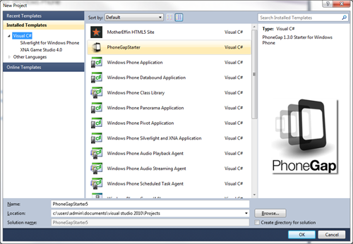 - copy the file CordovaStarter-x.x.x.zip to the folder : \My Documents\Visual Studio 2010\Templates\ProjectTemplates