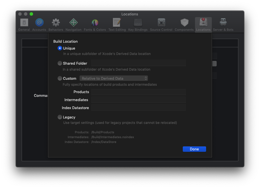 Missing Headers: Compilation errors relating to missing headers result from problems with the build location, and can be fixed via Xcode preferences: