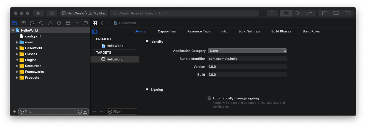 $ cordova create hello com.example.hello "HelloWorld"